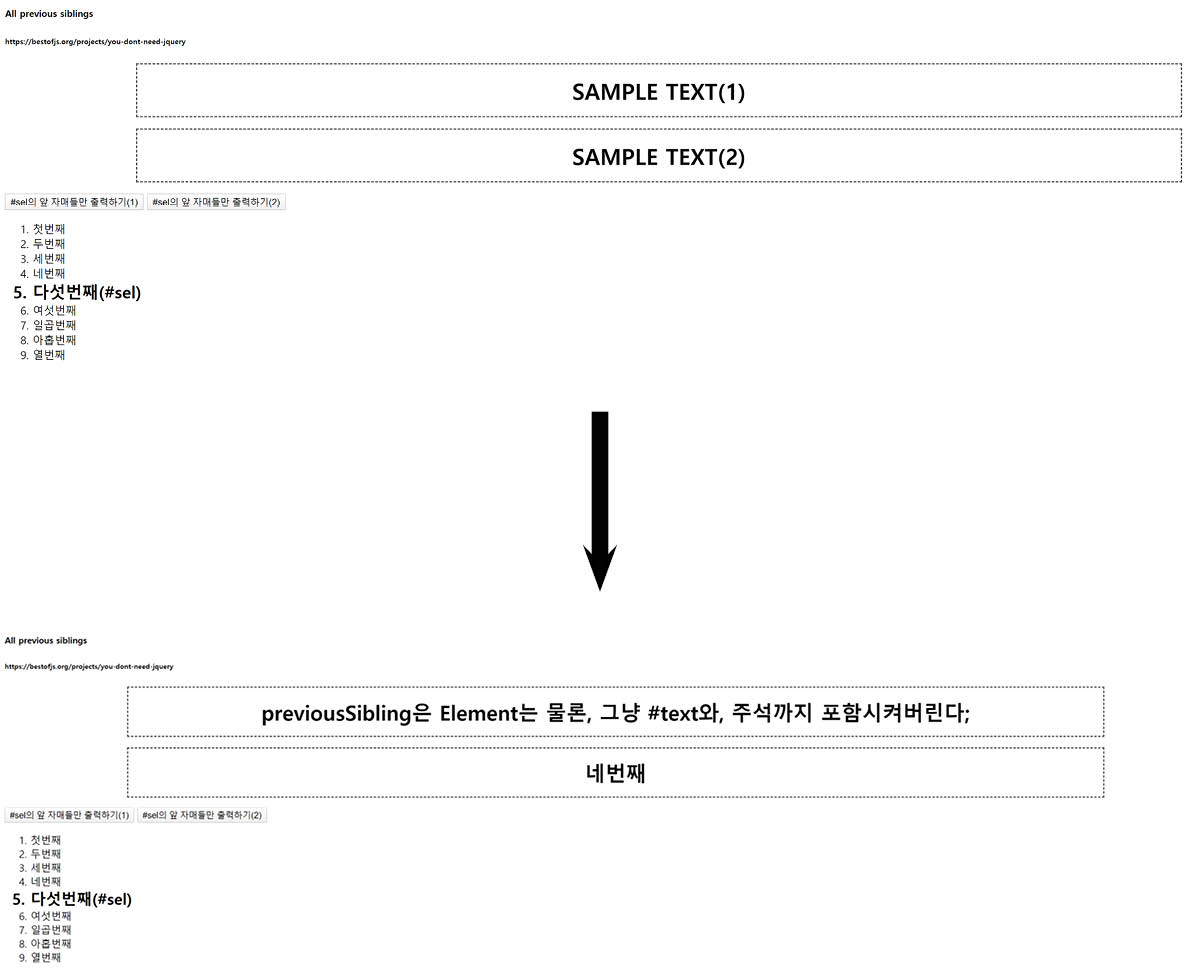previousSibling() > Element는 물론 #text와 주석까지 node로 카운트하여 반환