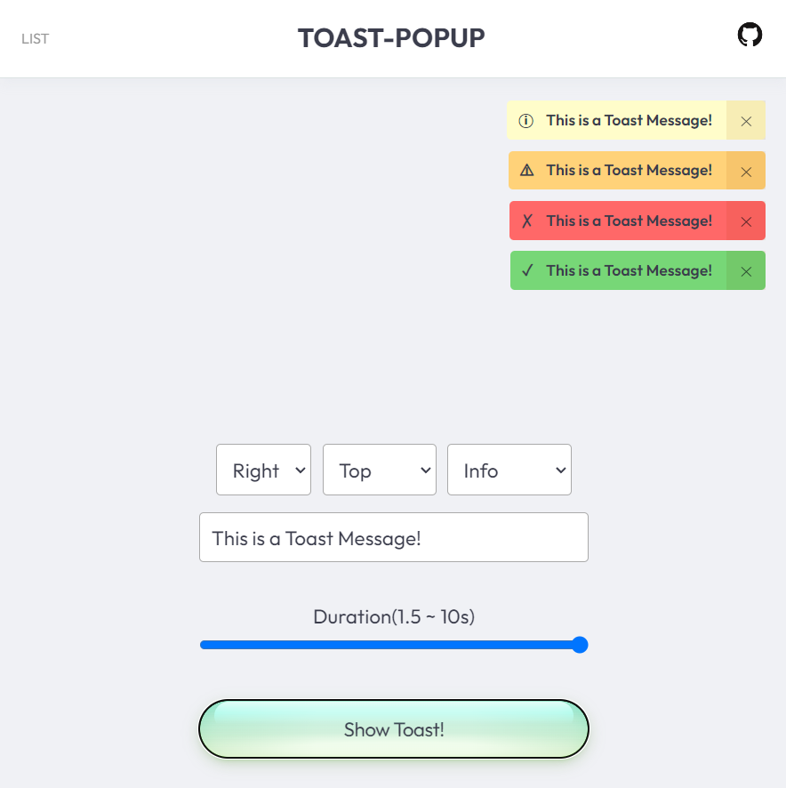 데모 : https://ohikmyeong.github.io/frontend-mini-challenges/toast-popup/ toast-popup ohikmyeong.github.io HTML 1 2 3 4 5 6 7 8 9 10 11 12 13 14 15 16 17 18 19 20 21 22 23 24 25 26 27 28 29 30 31 32 33 34 35 36 37 38 39 40 41 42 43 44 45 46 47 48 49 50 51 52 53 54 55 56 57 58 59 60 toast-popup left right top bottom success error warning info Duration(1.5 ~ 10s) Show Toast! 1 ✕ 2 ✕ 3 ✕ 10000 ✕ Colo..